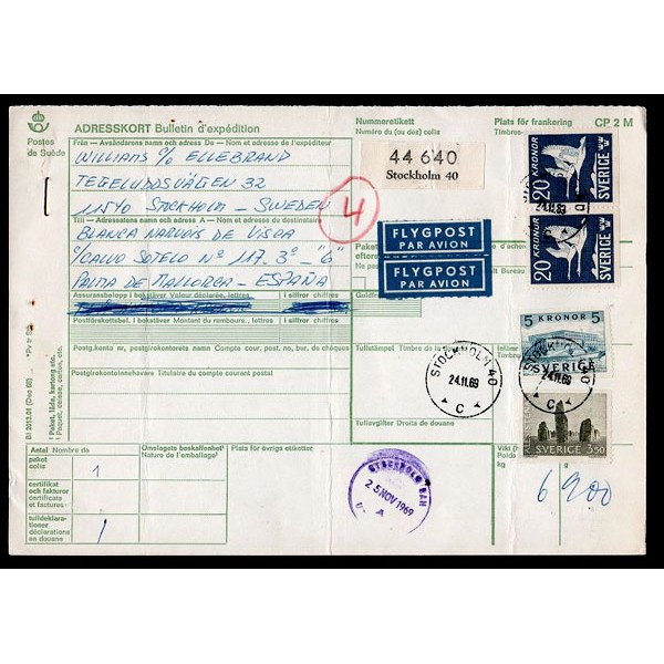 F.332B mfl, Stockholm 24-11-69 address card to Spain